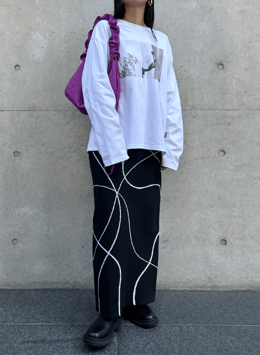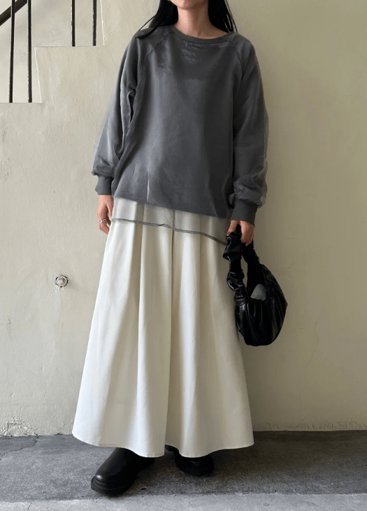 写真のようにスウェットと合わせるのも可愛いですし、ブラウス等と合わせるとまた全然違った雰囲気になります。