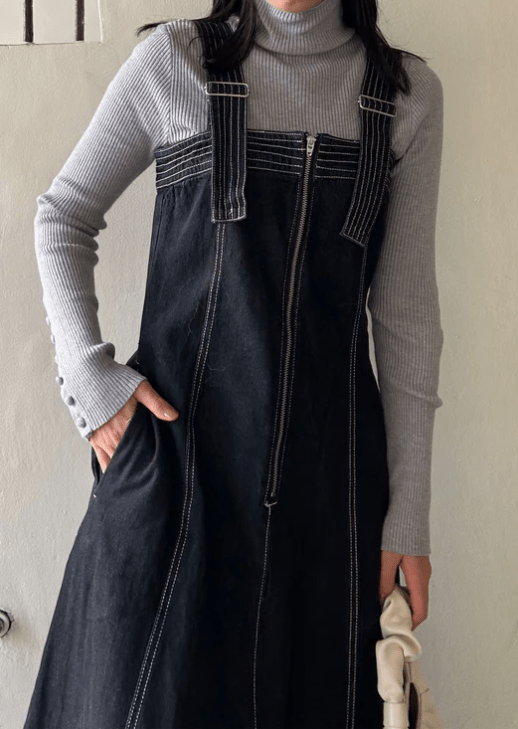 デニムワンピースなので、春夏は、半袖やノースリーブ、秋冬は写真のようにタートルネックやカーディガンと合わせる事ができます。