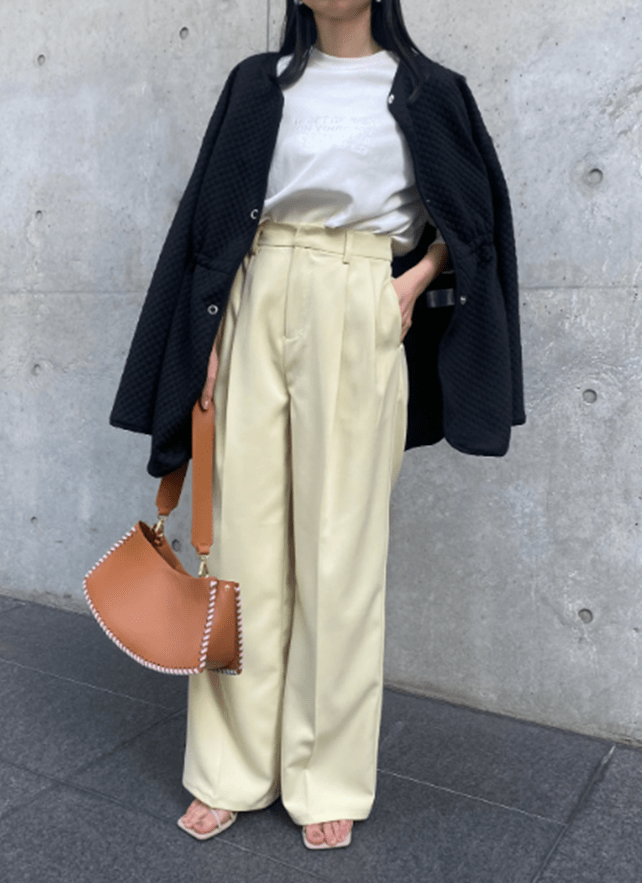 イエローのストレートパンツに、ホワイトカラーのロングコートを羽織るコーディネートに仕上がっています。