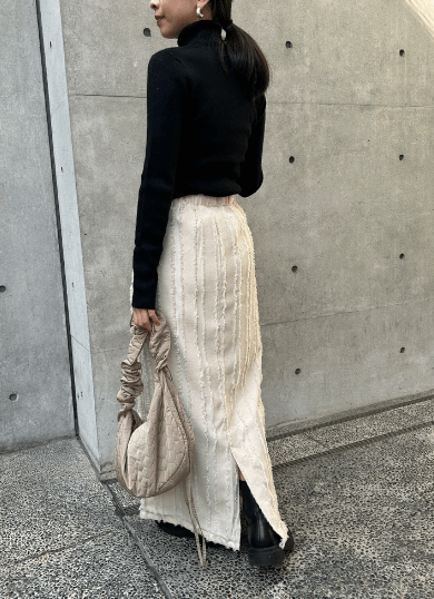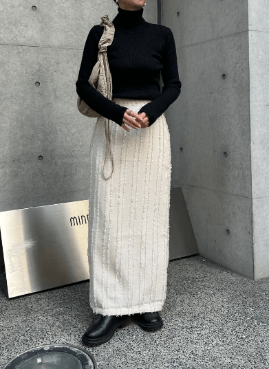 シャギーデザインが可愛いので、写真のように、トップスににシンプルなタートルネックを持ってくるだけで