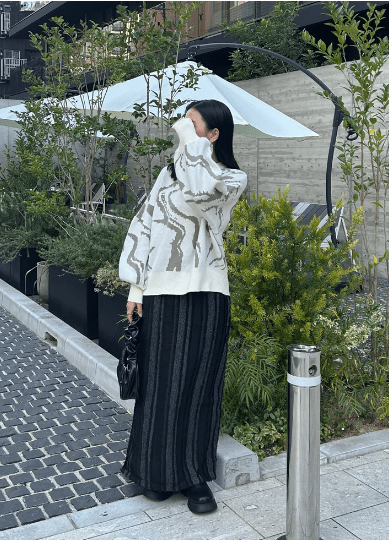 個人的にチャコールと白スカートの組み合わせがとても可愛いなと思いました。